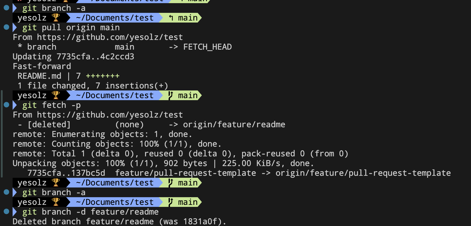 - git fetch -p : ๊นํ๋ธ ๋ธ๋์น ๋ชฉ๋ก ๋๊ธฐํ