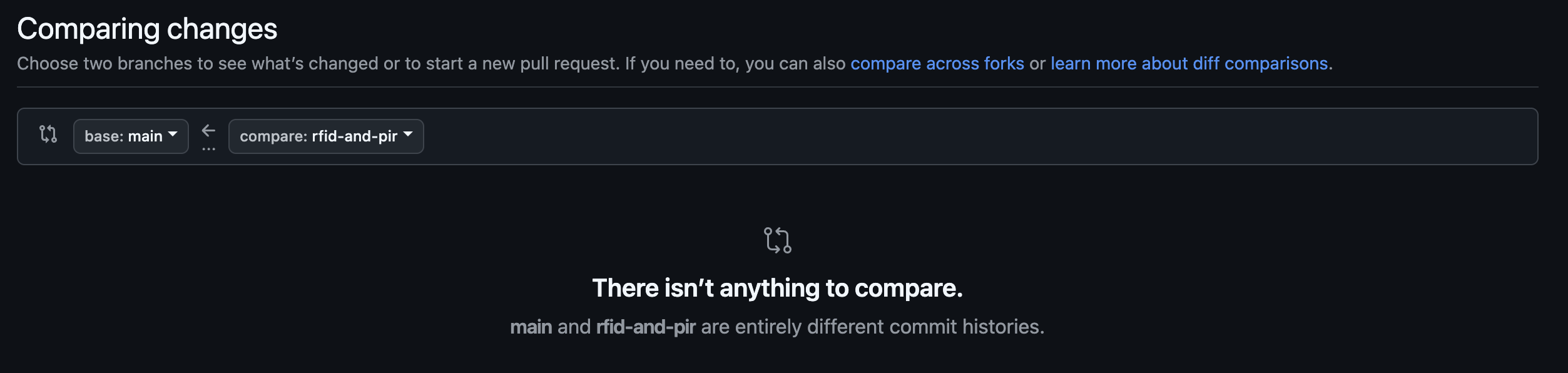 GIT์ ๊ธฐ๋ณธ์ ์ผ๋ก ๋ ๋ฆฝ์ ์ธ ํ์คํ ๋ฆฌ๋ฅผ ๋ณํฉํ์ง ์๋๋ค. ๋ฌธ์ ์ํฉ์์คํ ํ๋ก๊ทธ๋๋ฐ ์ค์ต์์, ํ ํ๋ก์ ํธ๋ฅผ ํ๋ฉฐ 4๊ฐ์ ๋ผ์ฆ๋ฒ ๋ฆฌํ์ด๋ฅผ ์ฌ์ฉํ๋ค.ํ์๋ค์ ๊ฐ์ ํ๋์ ํ์ด์ ๋์ํ๋ ๋ธ๋์น๋ฅผ ์์ฑํด ๋ ๋ฆฝ์ ์ผ๋ก ์์ ์ ์งํํ๋ค.๋ฌธ์ ๋ ์ต์ข ์ฝ๋๋ฅผ ์ ์ถํ๊ธฐ ์ํด ๊ฐ ๋ธ๋์น๋ฅผ main ๋ธ๋์น๋ก ๋ณํฉํ๋ ๊ณผ์ ์์ ๋ฐ์ํ๋ค.๊นํ๋ธ์์ ์๋์ ๊ฐ์ ๋ฉ์์ง๊ฐ ์ถ๋ ฅ๋๋ฉฐ PR ์์ฑ์ด ๋ถ๊ฐ๋ฅํ๋ค.There isn't anything to compare.main and rfid-and-pir are entirely different commit histories PR์ด ์์ ์ฌ๋ผ๊ฐ์ง ์๋ ์ํฉ์ด์๊ณ , ๊นํ๋ธ ์น ์ธํฐํ์ด์ค๋ง์ผ๋ก๋ ๋ฌธ์ ๋ฅผ ํด๊ฒฐํ ์ ์์๋ค.๋ก์ปฌ ํ๊ฒฝ์์ CLI(Command Line Interface)๋ก ๊ฐ..
